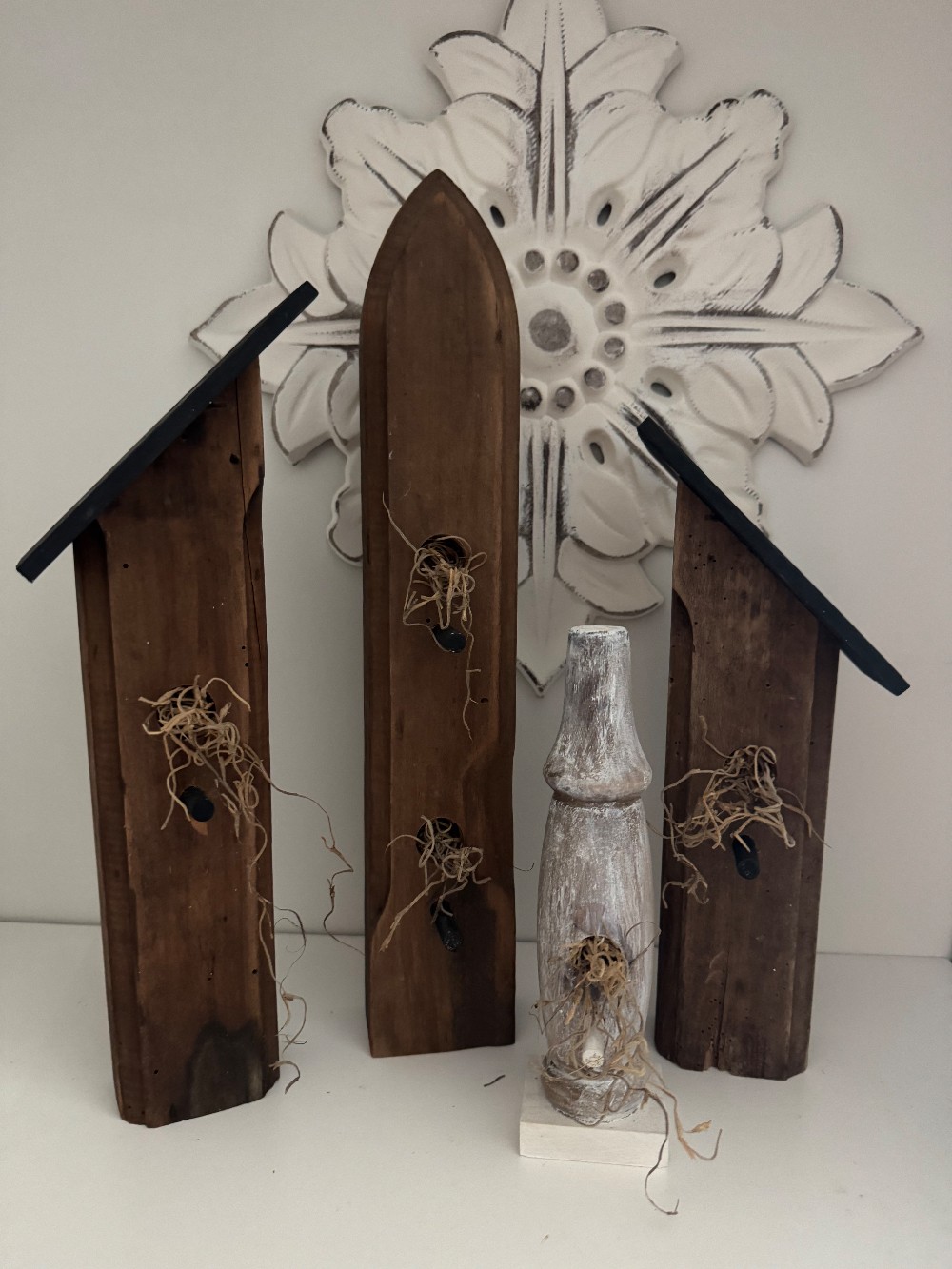 Locally made birdhouses from architectural salvage. Each is unique with different sizes and finishes. They are just the right size to add to a shelf or other decor.