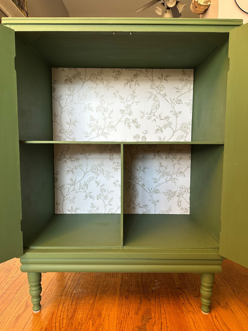 Sweet Mid-century two door cabinet painted in Dixie Belle English Ivy, Sealed with Dixie Belle flat and the inside partially lined with white and green wallpaper. Paper print has birds perched on limbs.