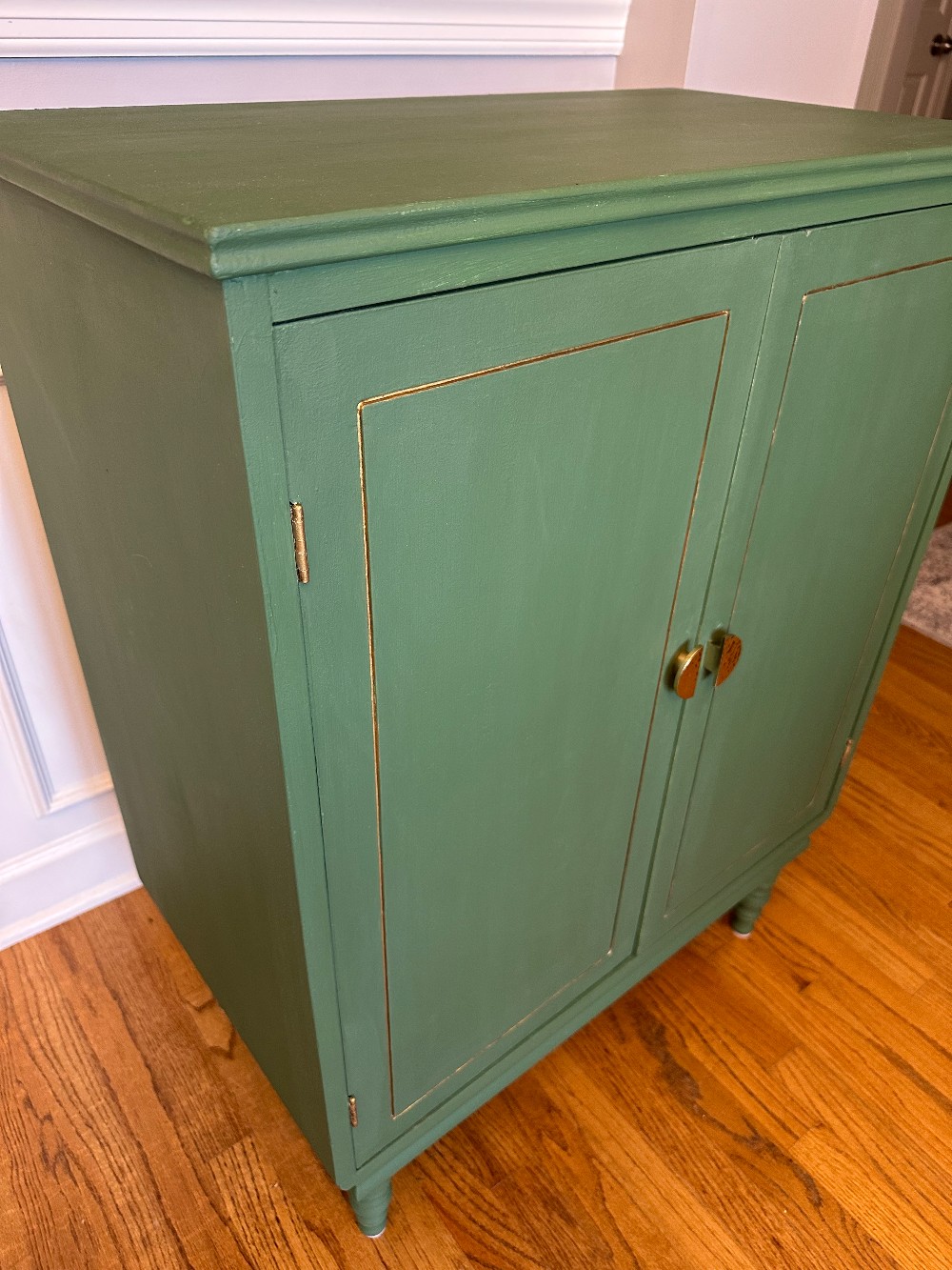 Green 2 door cabinet painted in Dixie Belle English ivy with white and green wall paper inside