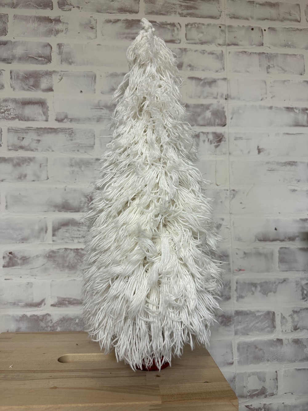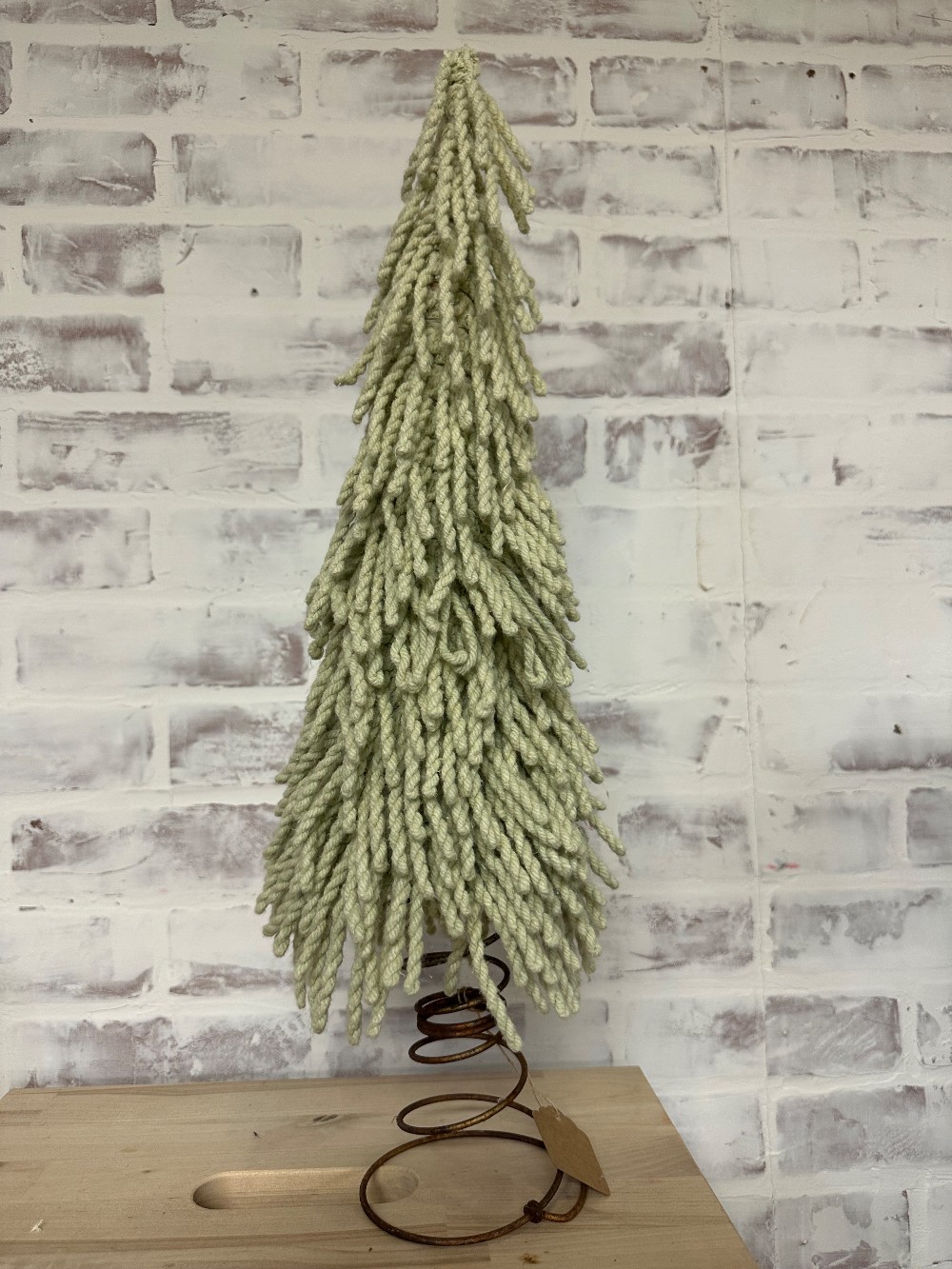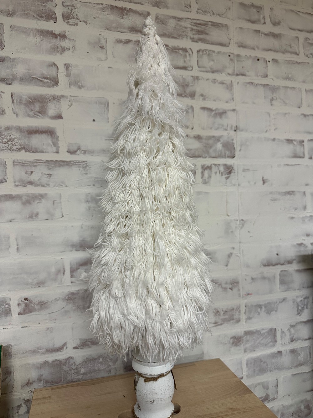 Cone shaped tree on unique stands and covered with vintage chenille bedspread trim. Range from 20”-24” tall and 6”-8” wide