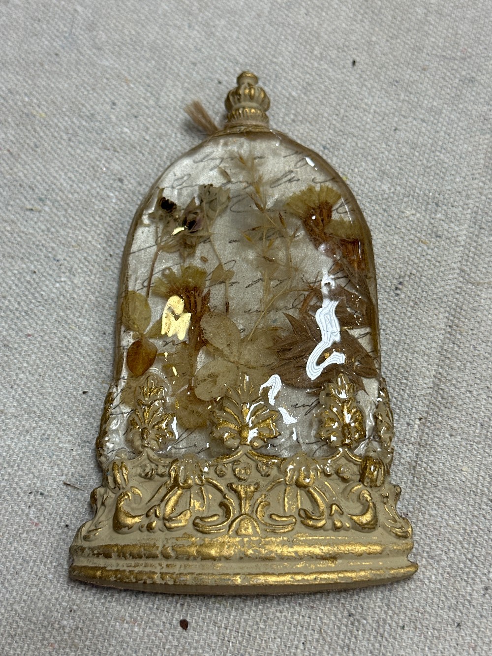 Resin cloche with pressed flowers with 2 magnets on back. Measures 3” x 6”