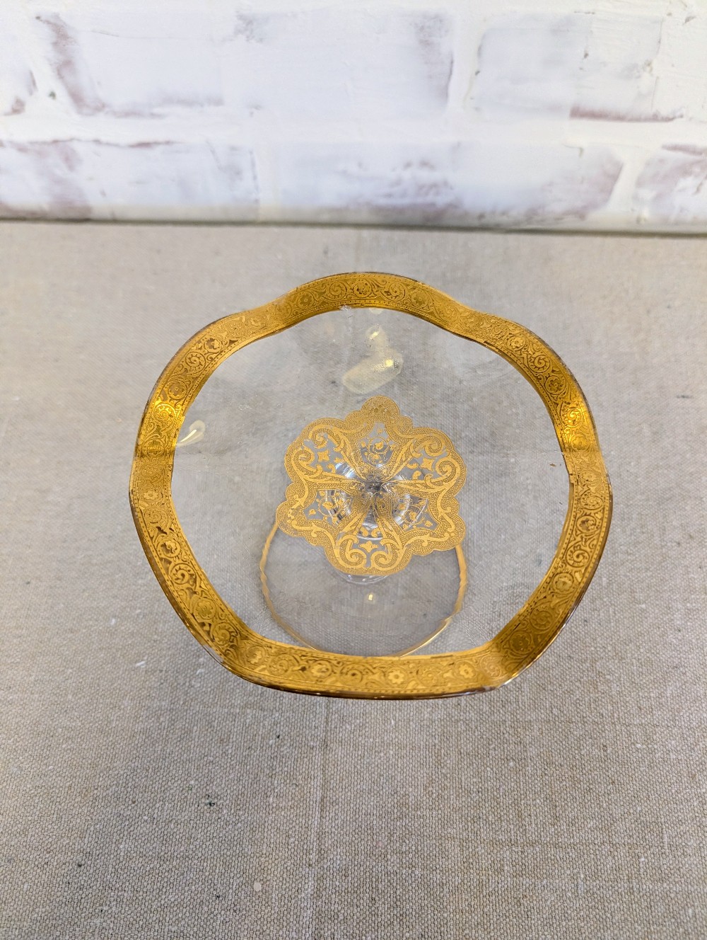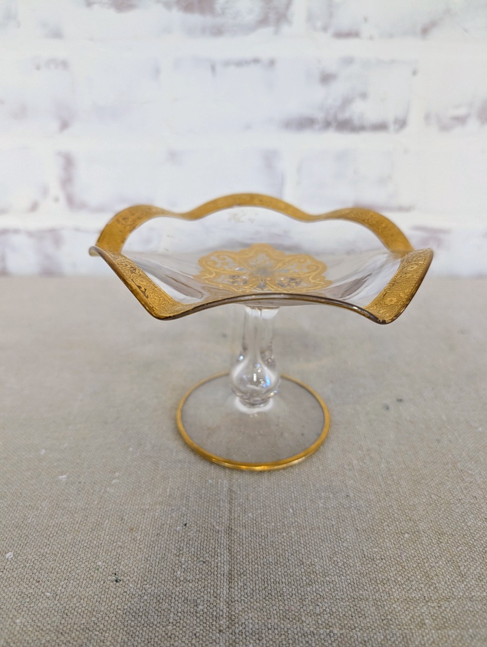 Home / GLASSWARE / Pedestal glass dish, gold plated, vtg