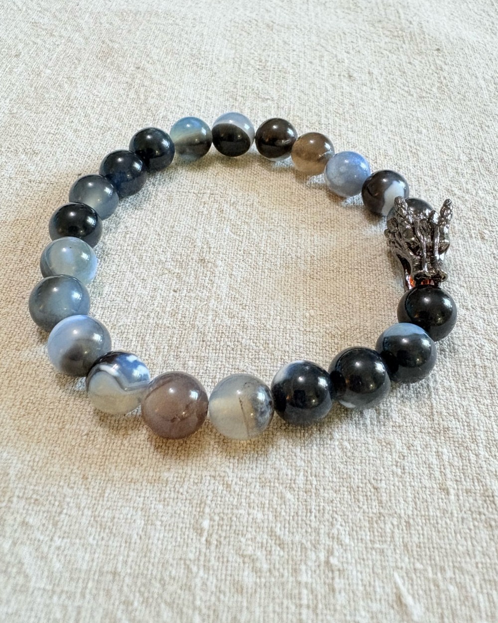 6 3/4 to 7 inch stretch bracelet. 8 mm storm agate with an antique silver toned dragon head focal. The 8mm storm agate beads are on 1 mm stretch cord. The dragon has tiny fire orange crystal in month.