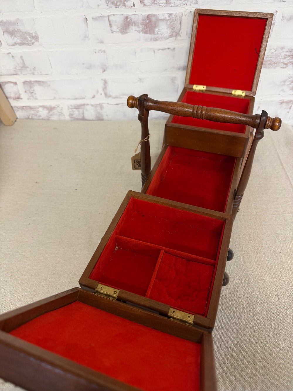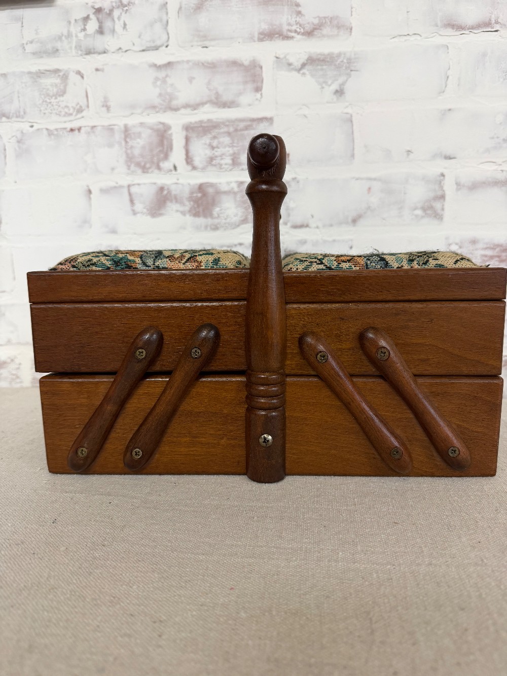 Vintage wooden sewing box with tapestry pincushion top and red fabric inside. 12” x 6” x 6”/ 9”(handle)