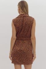 Leopard print half zip sleeveless collared mini dress featuring adjustable drawstring at waist. Elastic at waist. Pocket at sides. Unlined. Knit. Non-sheer. Lightweight.