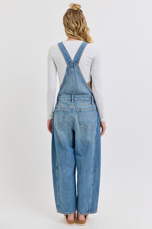 Mid-waisted barrel overalls! Side buttons, square neck, racerback straps with buckle closure and belt loops. Front rise 13", inseam 27". 100% cotton