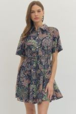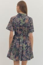 Animal print short sleeve mini dress featuring button placket at front. Drawstring waist with self-tie detail. Side pockets. Lined. Woven. Non-sheer. Lightweight.