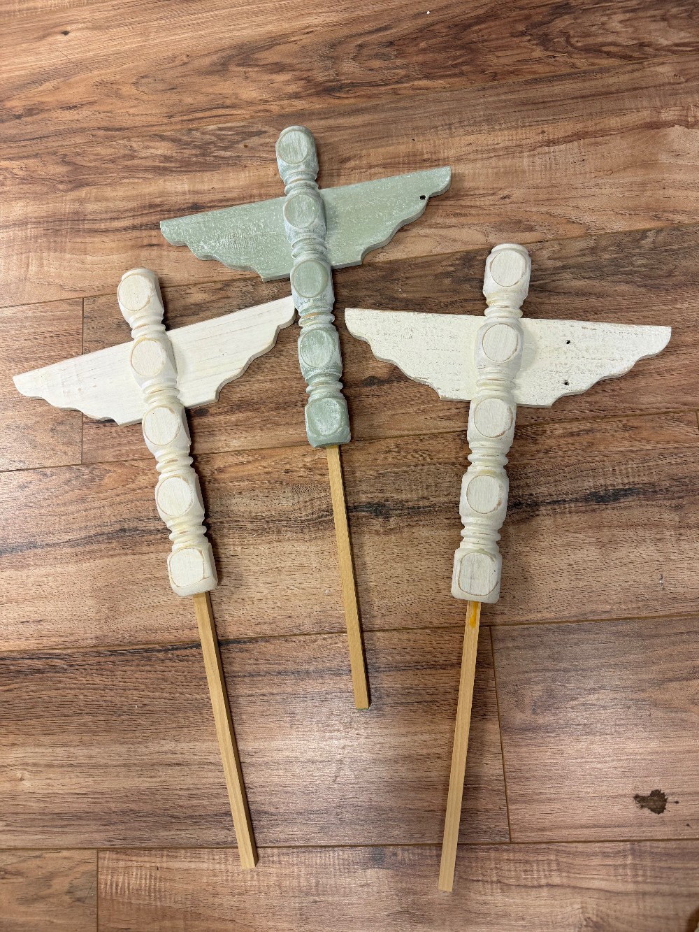 Garden angel stake made from architectural salvage. Painted with milk paint and sealed with General Finished exterior sealer. Add to a potted planted on your porch, garden or indoors. Shop pick up.